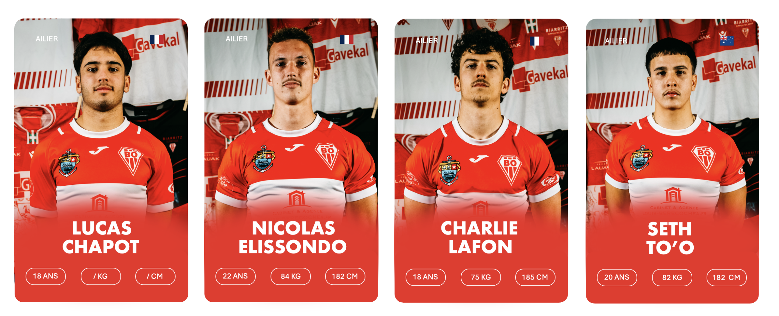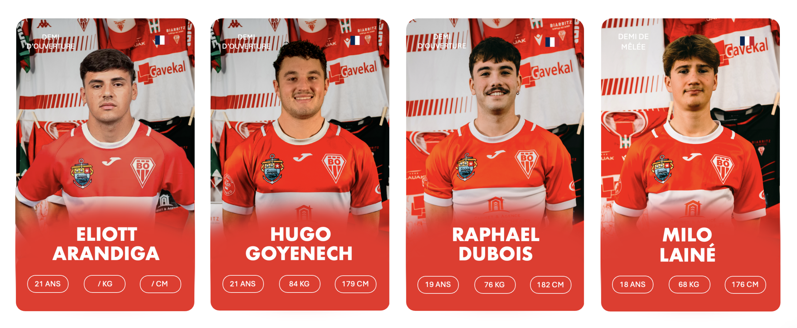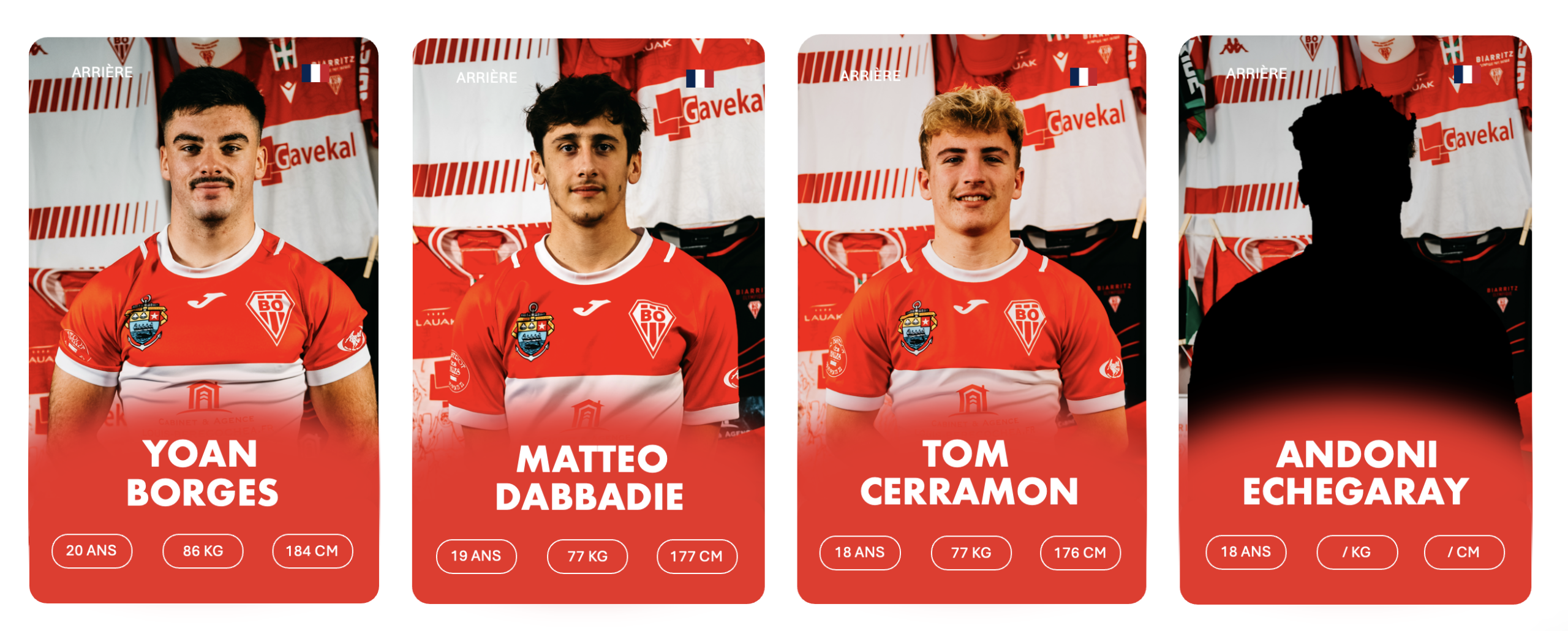 3ème rang debout de gauche à droite : Stanislav KUCHERENKO, Charlie LAFON, Markel ODRIOZOLA, Cyril FLAURAUD, Bruno VAGNI, Eneko MENAUT ROBLES, Inaki AGUERRE, Kepa EBODE N’KOA, Luke TAVALU, Roméo PETIT, Mattéo DABBADIE, Thomas BIDABé, Antton CARRERE, Millian OULDJi, Thibaud PICHARDIE, Cynseah TAUTALAFUA